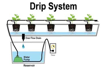 Hidroponik sistem irigasi tetes. Hidroponik drip sistem irigasi tetes sistem hidroponik irigasi atau drip adalah salah satu sistem yang paling sering digunakan dalam sistem tanam hidroponik di seantero dunia baik itu oleh para petani atau pembudidaya rumahan maupun pembudidaya atau petani komersial. Sistem hidroponik fertigasi yang merupakan singkatan dari fertilisasi pemupukan dan irigasi atau biasa disebut dengan sistem irigasi tetes adalah salah satu sistem hidroponik dengan menggunakan teknik yang menghemat air dan pupuk dengan meneteskan larutan air nutrisi secara perlahan langsung pada akar tanaman. Adalah salah satu jenis teknik hidroponik yang umum diadopsi dan diterapkan diskala perumahan hobi maupun untuk tujuan komersial. Sistem ini tergolong sederhana sebab tidak membutuhkan begitu banyaj perlengkapan serta multifungsi dan efektif.