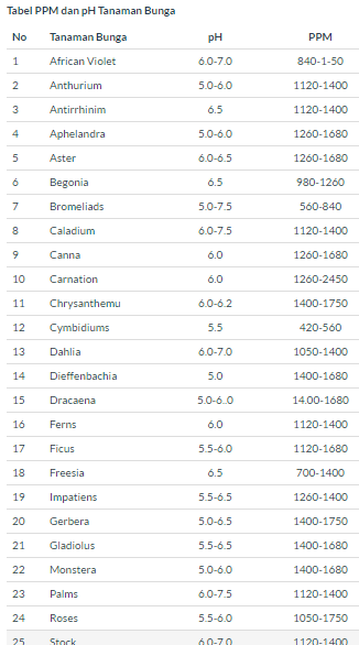 Tabel Ppm Dan Ph Pada Tanaman Bunga Dan Tanaman Herbal Istana